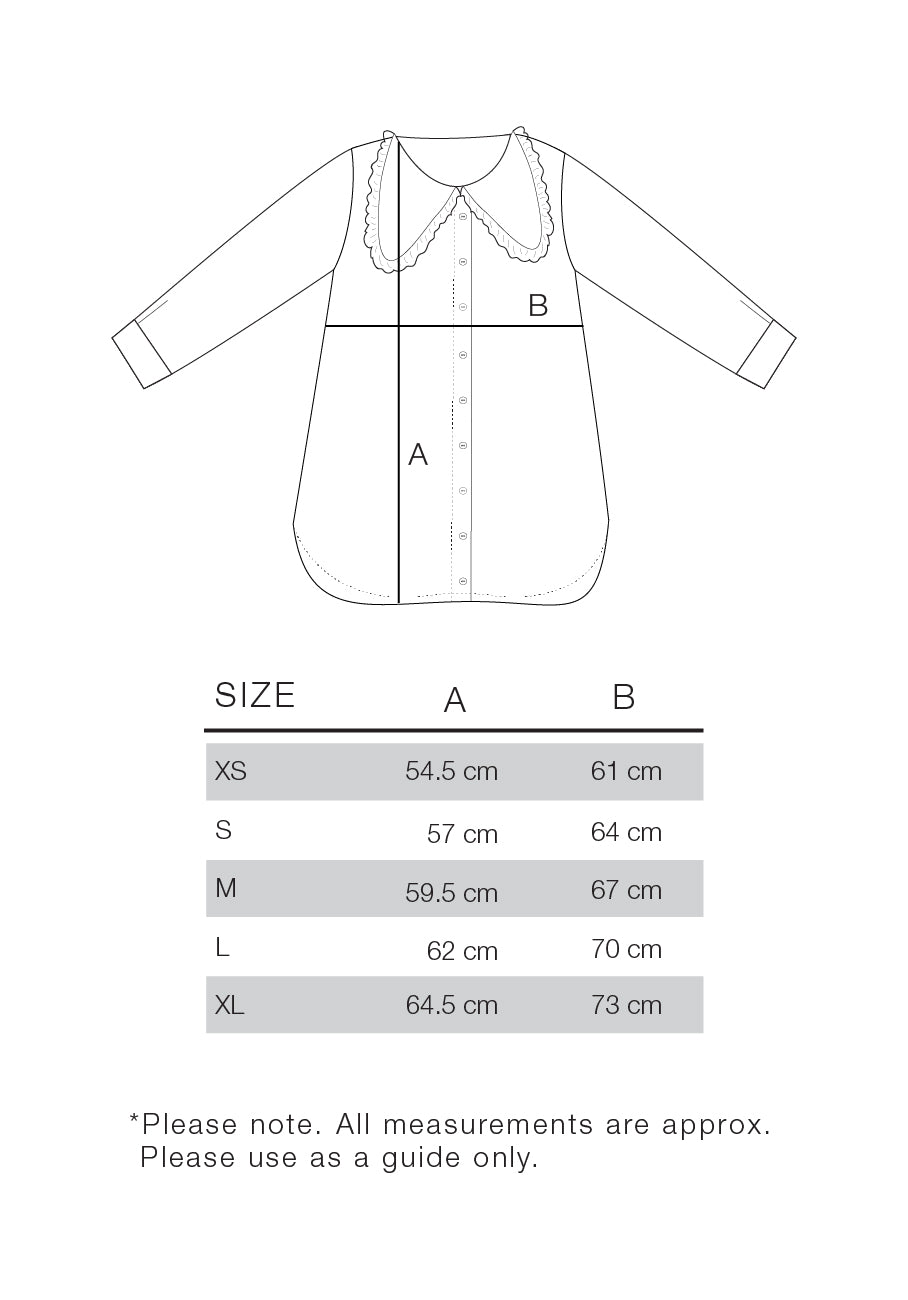 Please refer to the image at the end of the product image carousel for further details on measurements. Our size guide is only approximate measurements, taken on a flat surface and are of the front of the garment only. Please use this as a guide.