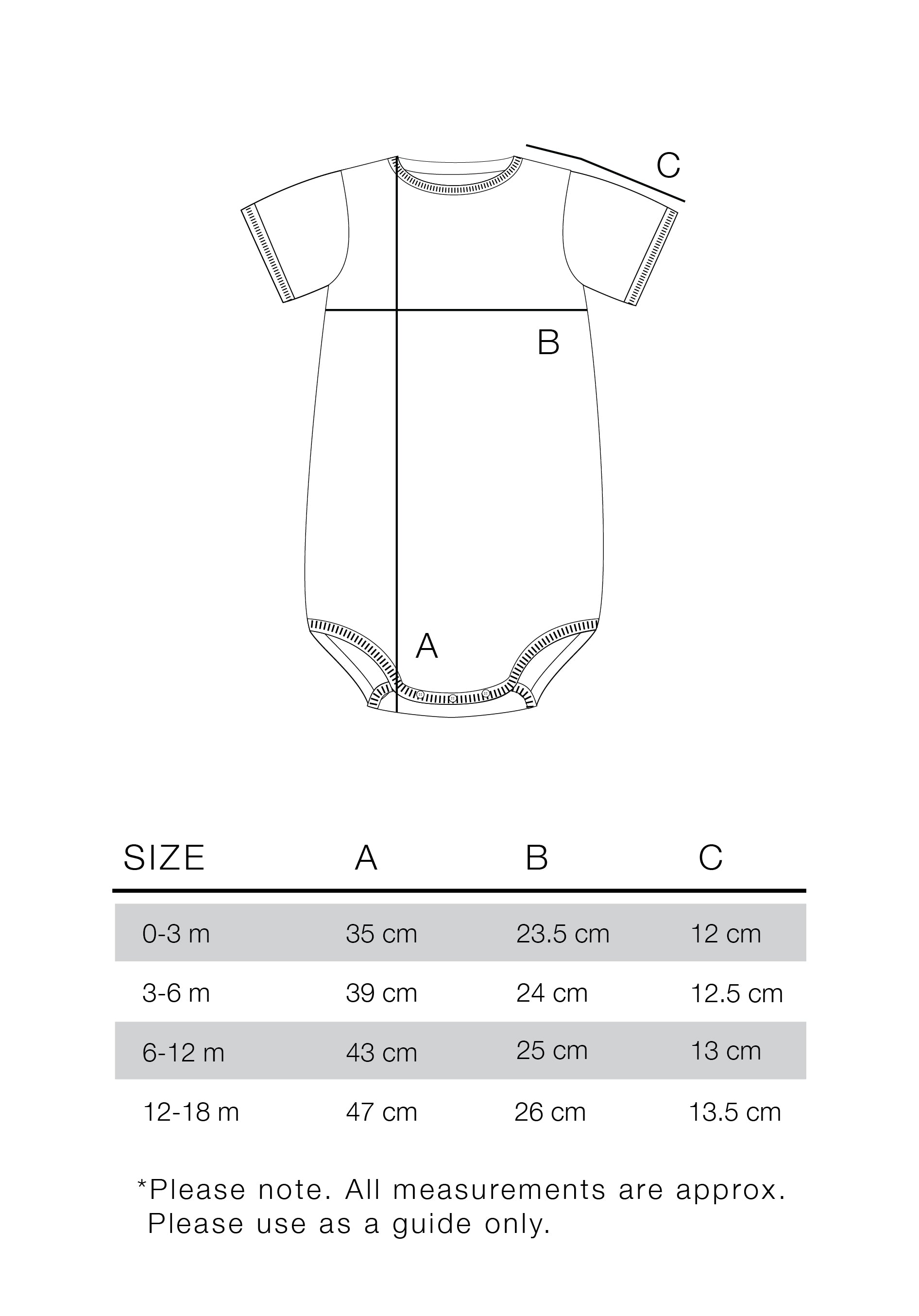 Our size guide is only approximate measurements, taken on a flat surface and are of the front of the garment only. Please use this as a guide.