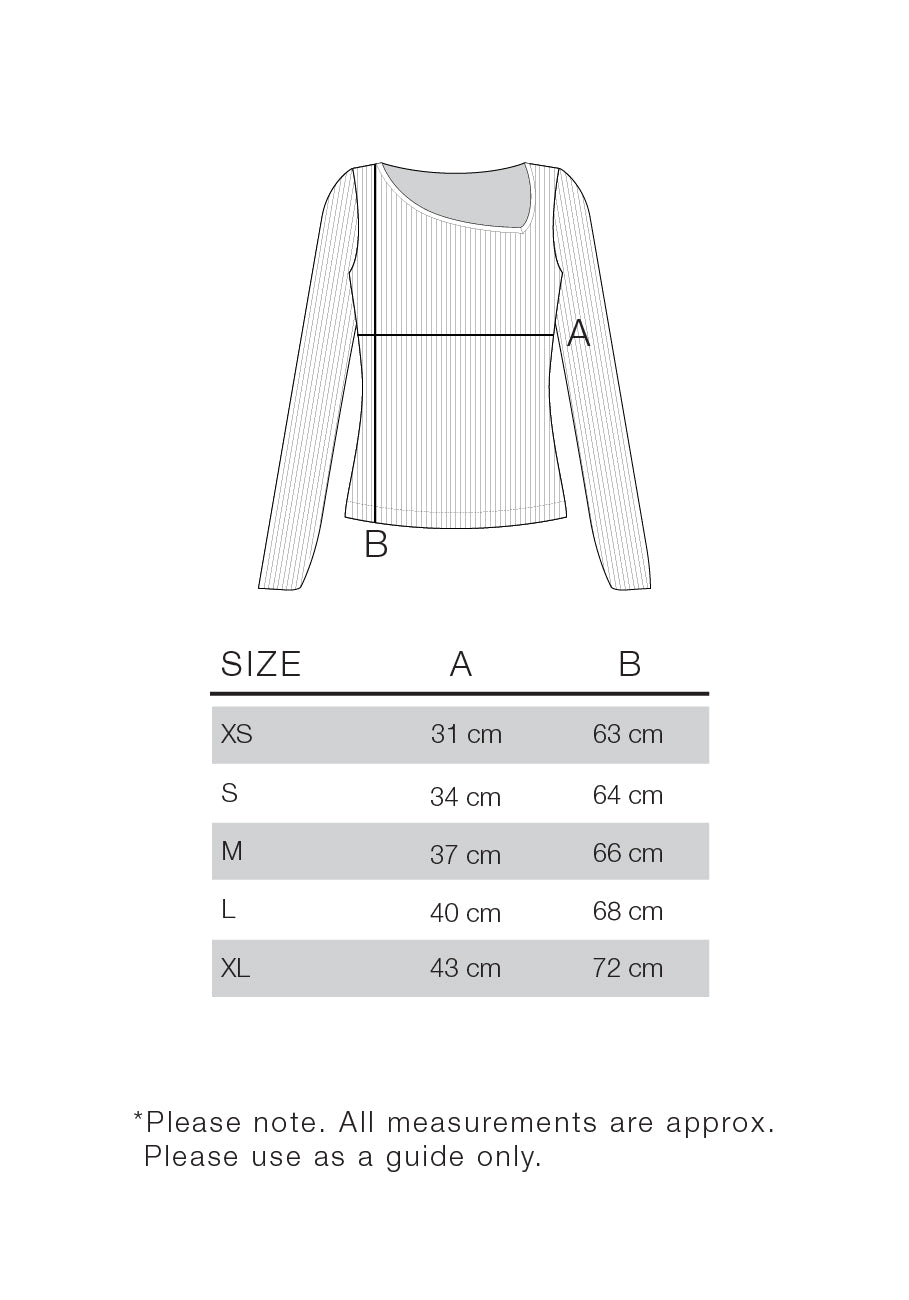 Please refer to the image at the end of the product image carousel for further details on measurements. Our size guide is only approximate measurements, taken on a flat surface and are of the front of the garment only. Please use this as a guide.