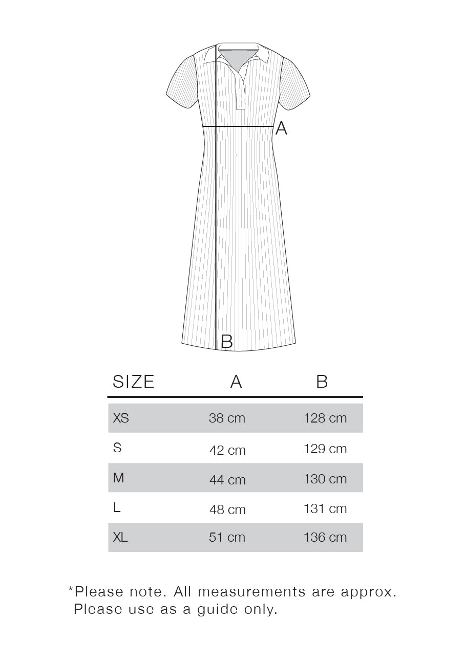 Please refer to the image at the end of the product image carousel for further details on measurements. Our size guide is only approximate measurements, taken on a flat surface and are of the front of the garment only. Please use this as a guide.